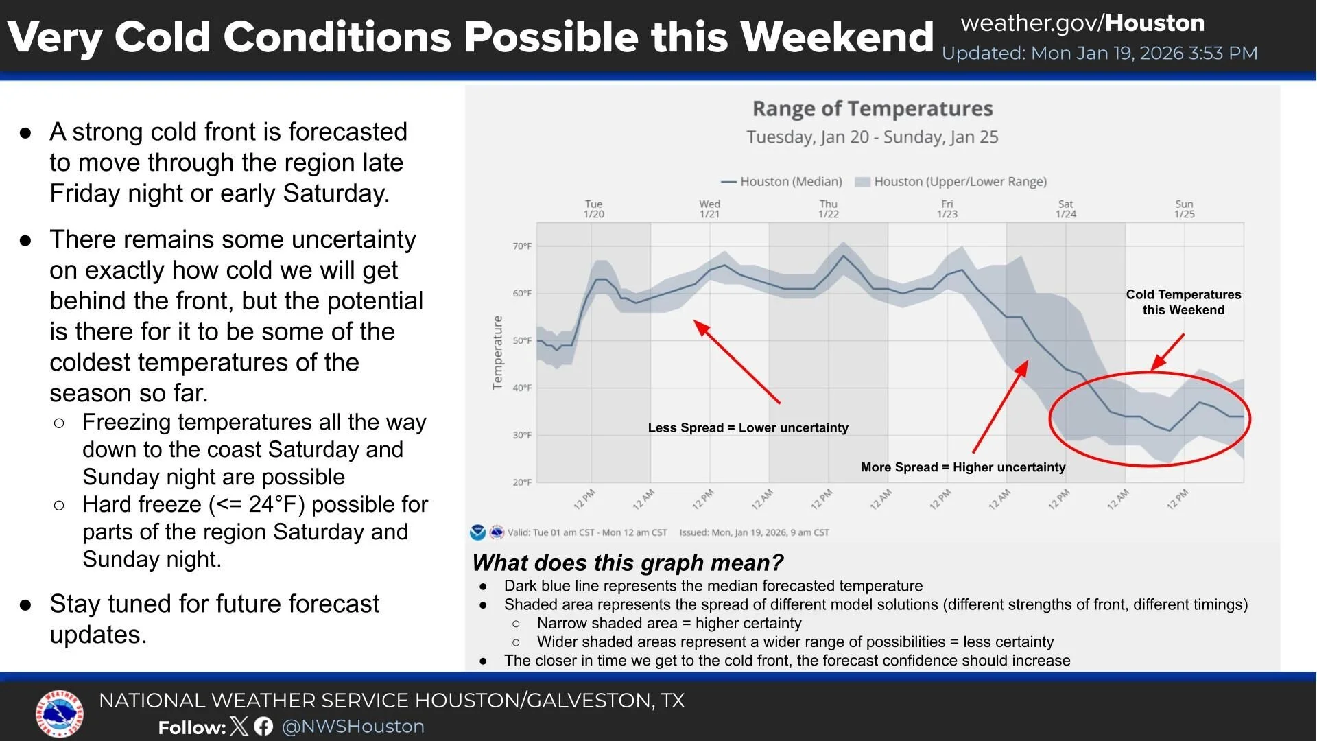 As of Tuesday, the National Weather Service Houston/Galveston Office forecasts a "strong cold front" to make its way into the greater Houston area late Friday into Saturday. The front is expected to usher in the coldest temperatures of the season so far this year, according to NWS. A hard freeze — with temperatures of 24 degrees or lower — is possible for parts of the region on Saturday and Sunday nights.