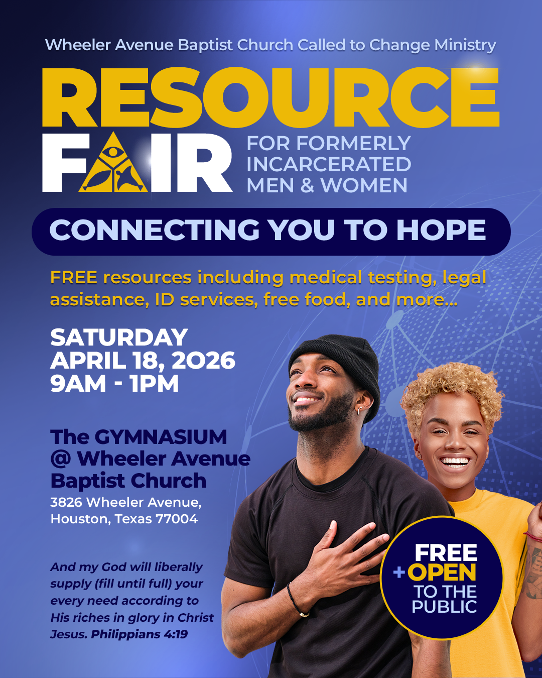 Wheeler Avenue Baptist Church: Called to Change Ministry Resource Fair Saturday, April 18, 2026 9:00 AM 1:00 PM Wheeler Avenue Baptist Church - The Gynasium 3826 Wheeler Avenue Houston, TX, 77004 United States (map) Google Calendar ICS