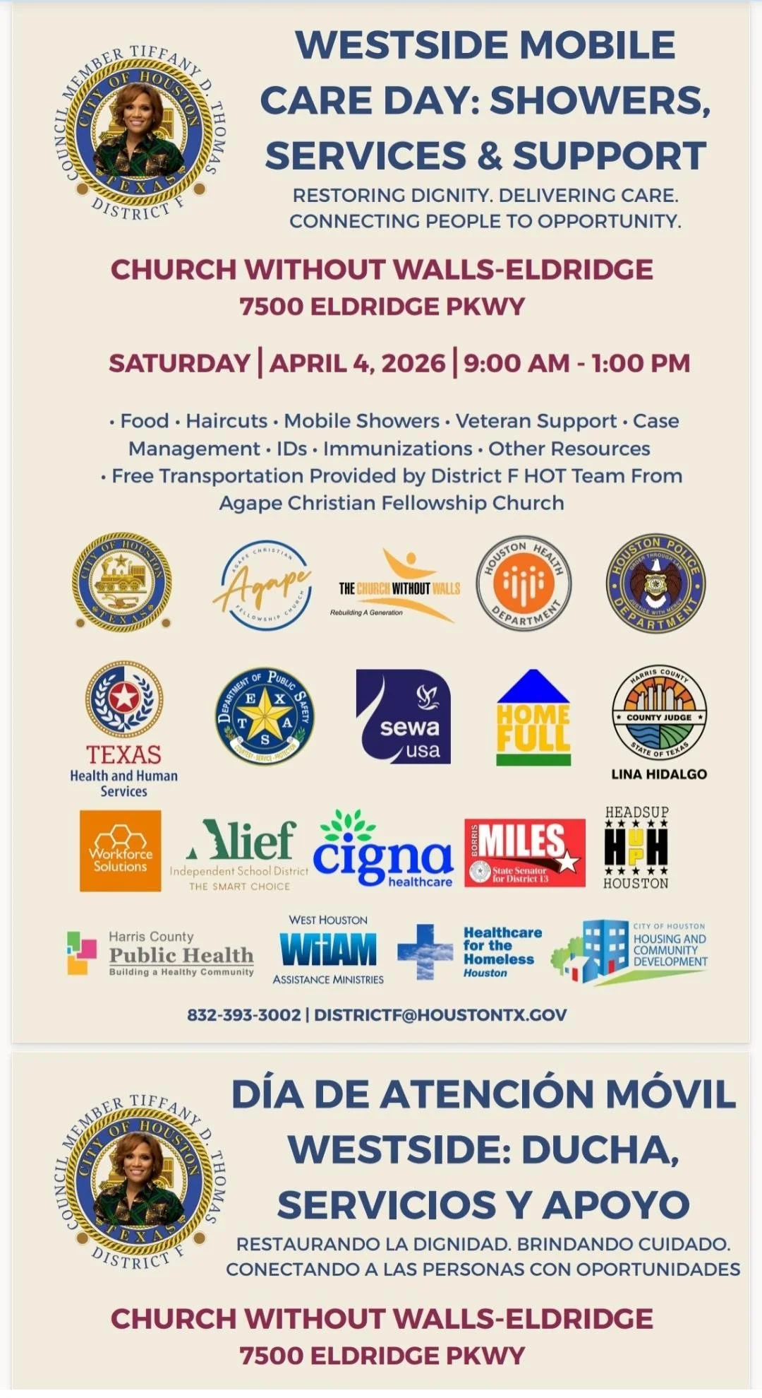 Council Member Tiffany Thomas: Westside Mobile Care Day Saturday, April 4, 2026 9:00 AM 1:00 PM Church Without Walls - Eldridge 7500 Eldridge Parkway Houston, TX, 77083 United States (map) Google Calendar ICS