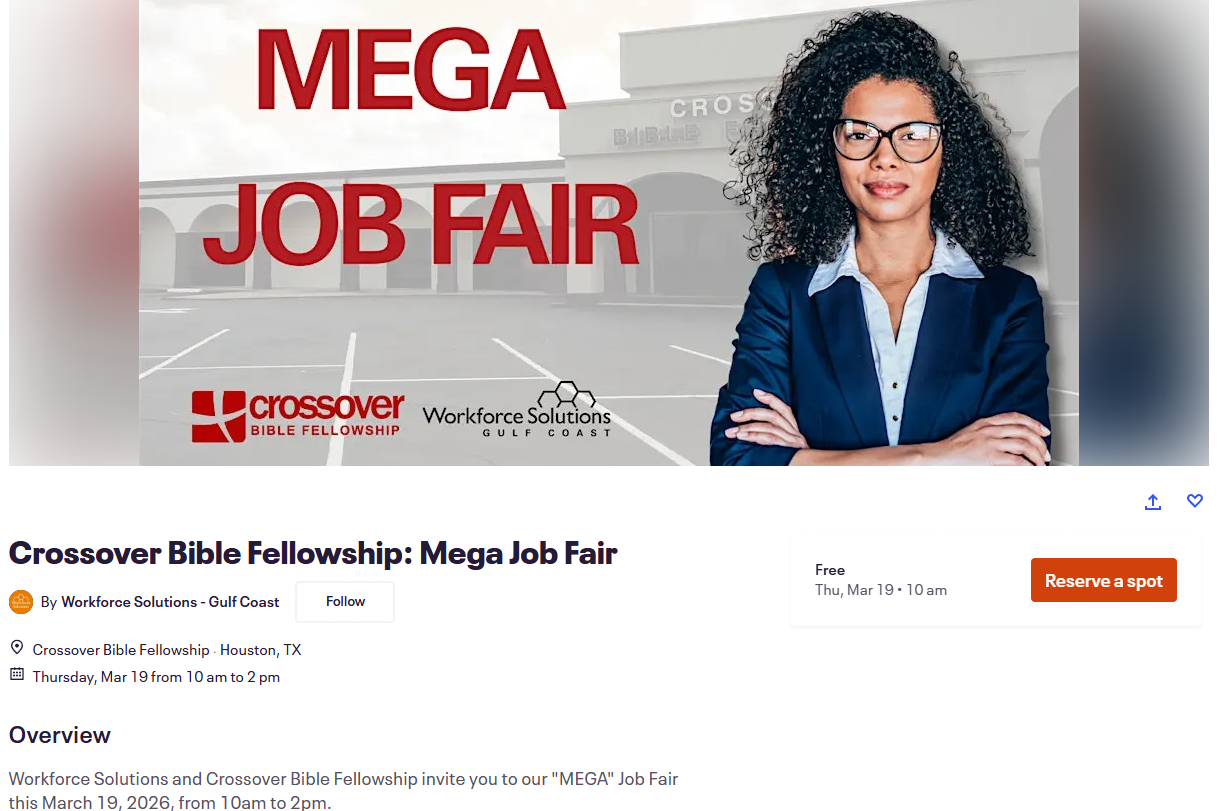Crossover Bible Fellowship: Mega Job Fair Thursday, March 19, 2026 10:00 AM 2:00 PM Crossover Bible Fellowship 12332 Perry Road Houston, TX, 77070 United States (map) Google Calendar ICS