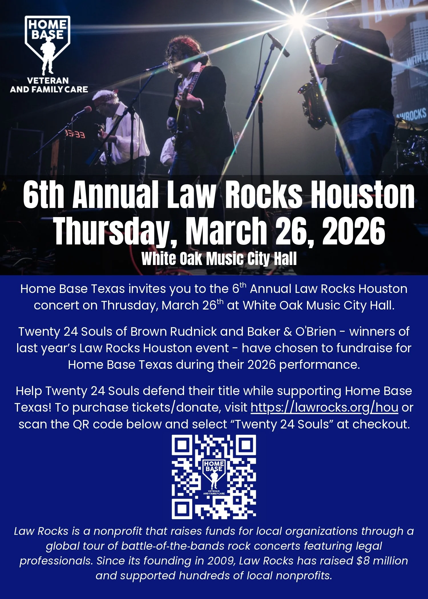 Home Base Veteran and Family Care: 6th Annual Law Rocks Houston Concert Thursday, March 26, 2026 6:30 PM 10:00 PM White Oak Music City Hall 2915 North Main Street Houston, TX, 77009 United States (map) Google Calendar ICS Please scan the QR code or click on the image for more information.