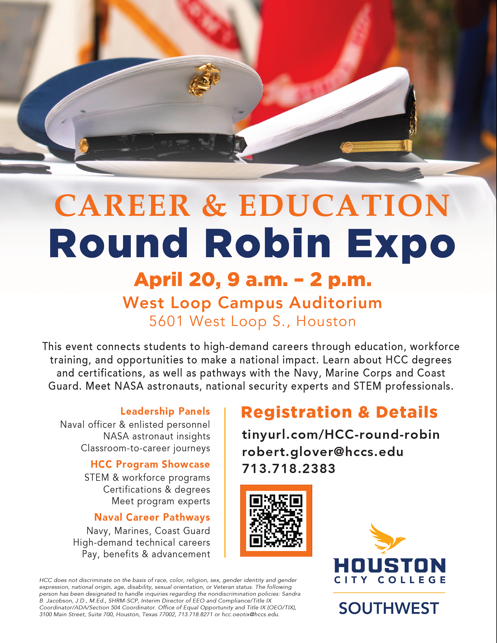 Houston City College: Career & Education Round Robin Expo Monday, April 20, 2026 9:00 AM 2:00 PM Houston City College West Loop Campus Auditorium 5601 West Loop South Houston, TX, 77081 United States (map) Google Calendar ICS Please scan the QR code or click on the image to register.