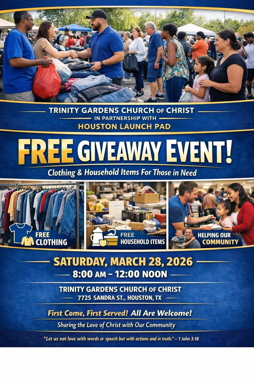 Houston Launch Pad: Free Giveaway Event Saturday, March 28, 2026 8:00 AM 12:00 PM Trinity Gardens Church of Christ 7725 Sandra Street Houston, TX, 77016 United States (map) Google Calendar ICS