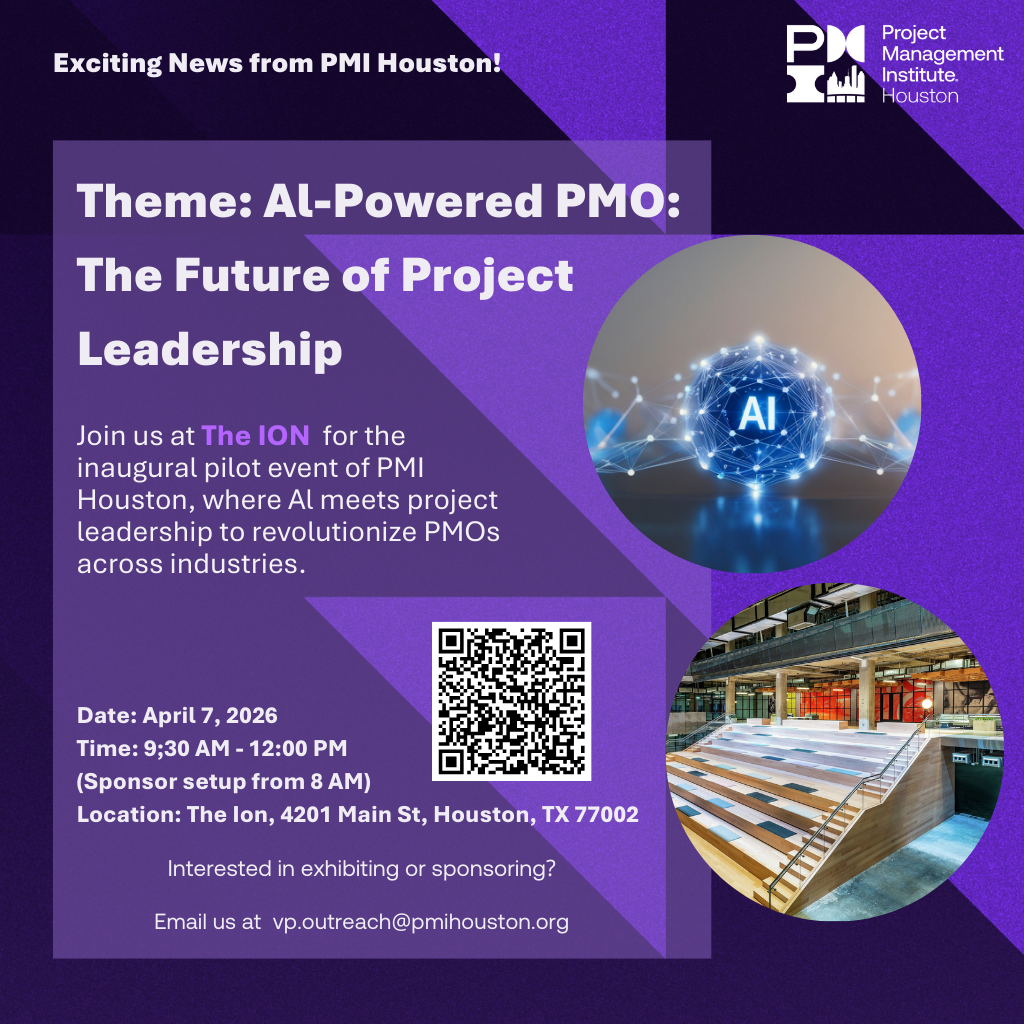 Project Management Institute: AI Powered PMO Tuesday, April 7, 2026 9:30 AM 12:00 PM The Ion 4201 Main Street Houston, TX, 77002 United States (map) Google Calendar ICS Please scan the QR code or click on the image to register.