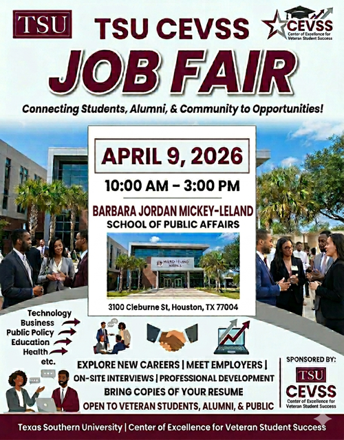 Texas Southern University - CEVSS Job Fair Thursday, April 9, 2026 10:00 AM 3:00 PM TSU Barbara Jordan Mickey-Leleand School of Public Affairs 3401 Cleburne Street Houston, TX, 77004 United States (map) Google Calendar ICS
