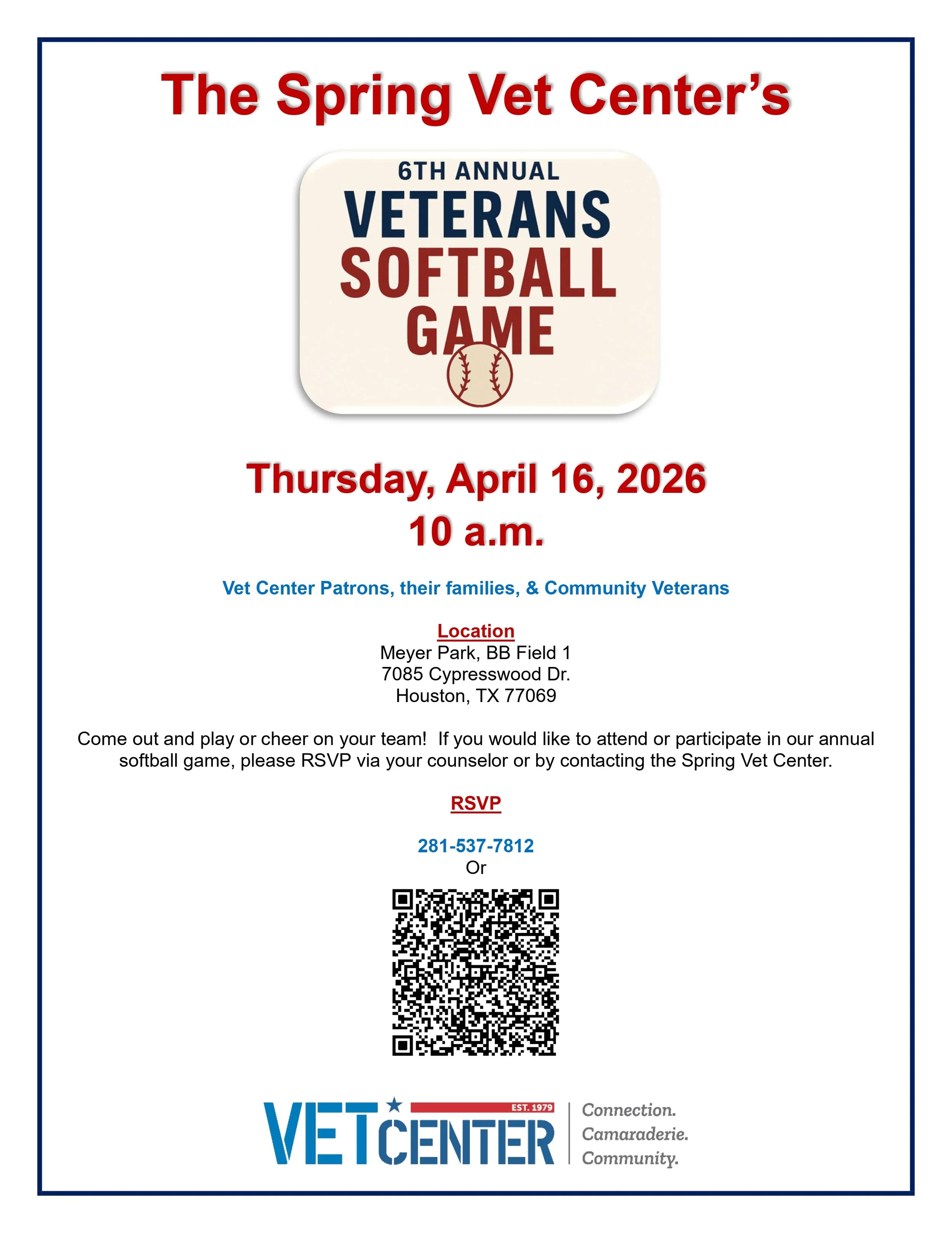 The Spring Vet Center's 6th Annual Veterans Softball Game Thursday, April 16, 2026 10:00 AM 1:30 PM Meyer Park, BB Field 1 7085 Cypresswood Drive Houston, TX, 77069 United States (map) Google Calendar ICS Please scan the QR code or click on the image to register.