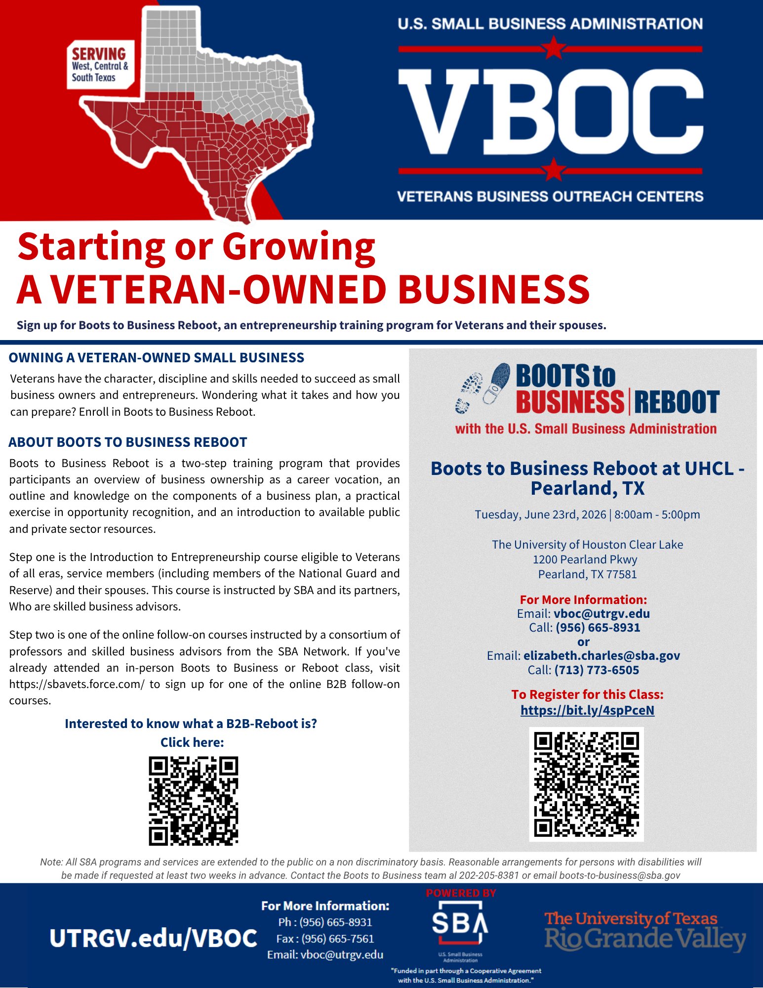 U.S. Small Business Administration: VBOC - Boots to Business Reboot Tuesday, June 23, 2026 8:00 AM 5:00 PM University of Houston Clear Lake Pearland 1200 Pearland Parkway Pearland, TX, 77581 United States (map) Google Calendar ICS Please scan the QR code or click on the image to register.