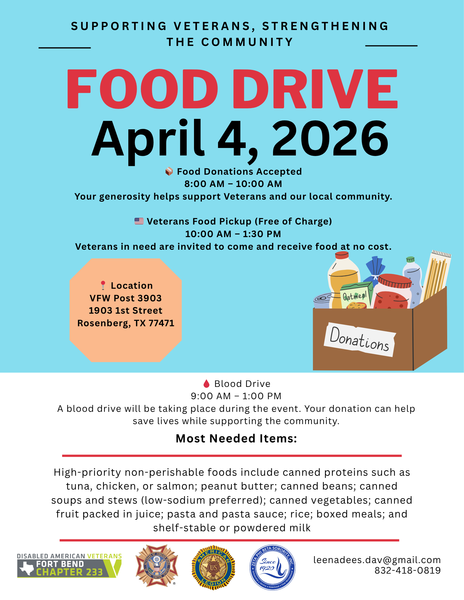 Back to All Events VFW Post 3903: Food Drive Veteran Food Distribution Saturday, April 4, 2026 10:00 AM 1:30 PM VFW Post 3903 1903 1st Street Rosenberg, TX, 77471 United States (map) Google Calendar ICS
